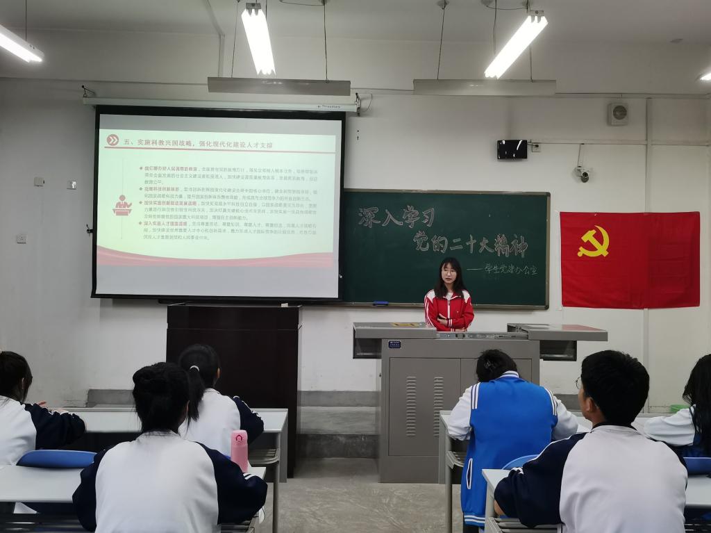 宣讲活动由员工党建办纪检部负责人汪旭蕾同学担任主讲,党建办全体员工干部参加。汪旭蕾同学围绕党的历史、形势政策、时事热点等内容展开宣讲,以互动问答的方式带领同学们深入学习党的二十大报告中的新观点、新论断、新思想,深刻领会党的二十大主题和二十大报告主要内容,她带领同学们共同学习了关于过去5年的工作和新时代10年的伟大变革,关于马克思主义中国化时代化,关于中国式现代化,关于全面建设社会主义现代化国家的目标任务和关于党的全面领导和全面从严治党五个部分的内容。汪旭蕾希望在场同学后续能继续加强自身学习,强化自身专业能力,做到学以致用,让青春之花在不懈奋斗中绚丽绽放。