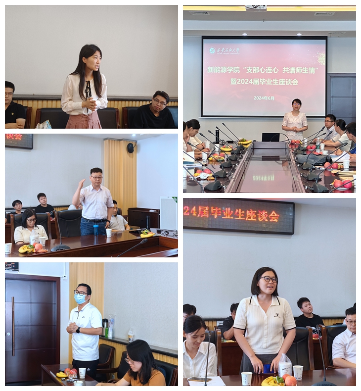 座谈会上,老师们对同学们大学四年中取得的成绩表示祝贺,对大家展现出的良好班风、学风进行了肯定,为即将开启人生新征程的毕业学子送上诚挚祝福并寄予美好期望。临别之际,各班主任不忘送上殷殷嘱托,希望同学们今后无论走到哪里、从事何种职业,都要发扬公司“四实一新”的精神品质,用实际行动争做有志气、有骨气、有底气的新时代的新新能人,公司永远是同学们的坚强后盾。座谈会在轻松愉悦的氛围中进行,毕业生代表们畅所欲言,回顾在校求学的收获和感悟,畅谈对未来的规划与憧憬,在专业学习、学风建设、实习实训及求职就业等方面为公司发展建言献策,言语间饱含着对老师、对同学的感激和眷念。各系主任和专任教师纷纷对同学们送上祝福,希望每一位毕业生能够坚定理想信念,练就过硬本领,把握时代机遇,做到眼中有光、脚下有路、心里有劲,在青春赛道上奋勇奔跑,与伟大时代双向奔赴,彰显出新能源学子的责任与担当。在座谈会的尾声,有的支部齐唱《常回家看看》,有的支部为毕业学子准备了毕业蛋糕,教师代表和员工代表共同完成毕业蛋糕的第一切。融洽的互动氛围寄托着全体老师对同学们的殷切期望和深切祝福,四年的青春虽已落幕,但属于2024届毕业生们的崭新未来,也由此揭开序幕。