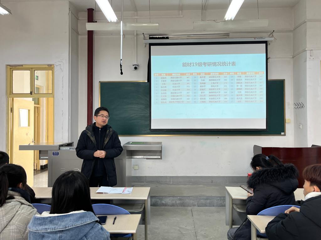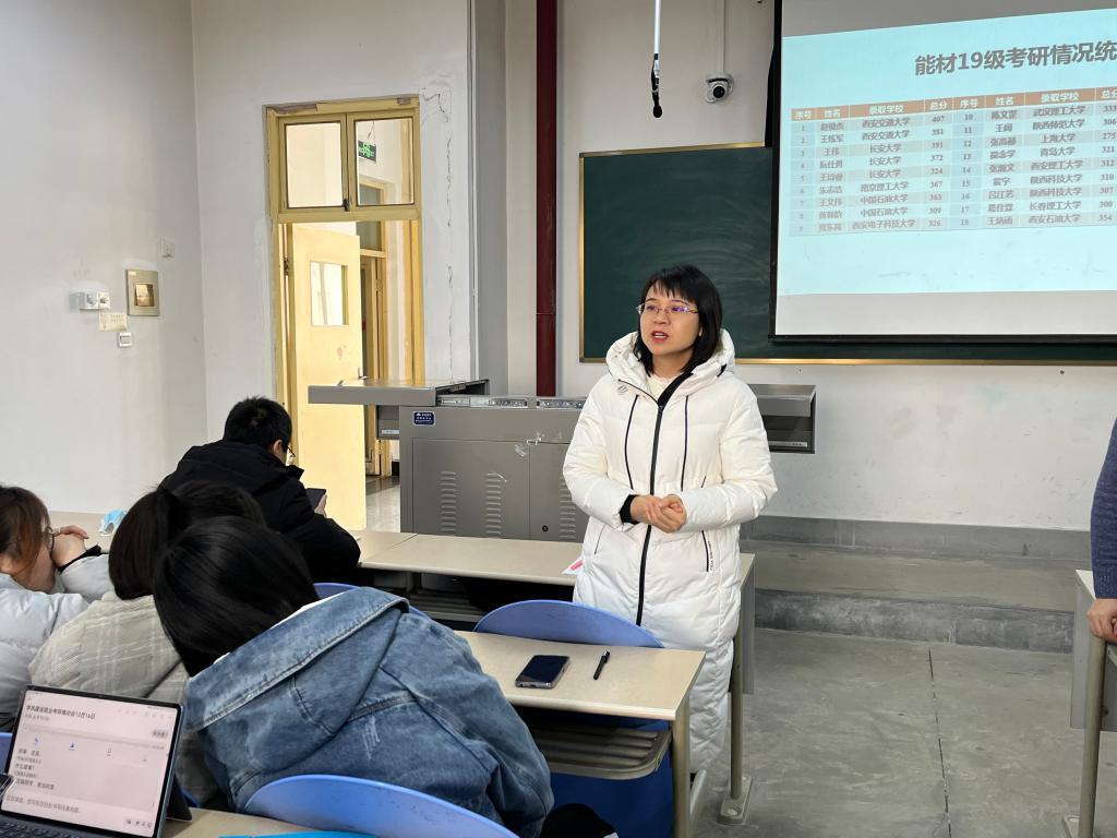 安敏荣从本专业考研录取情况、院校选择、专业分布等方面为大家进行了考研形势的分析,她鼓励同学们要增强考研信心,并建议同学们在新能源领域里能持续深造,提高自身专业素养,满足国家和社会对生态文明建设的人才需求。紧接着,安敏荣结合自身实际和社会发展强调了考研的重要性,并从报考院校和专业的选择、研究生导师的选择等方面为同学们作了科学分析和指导。