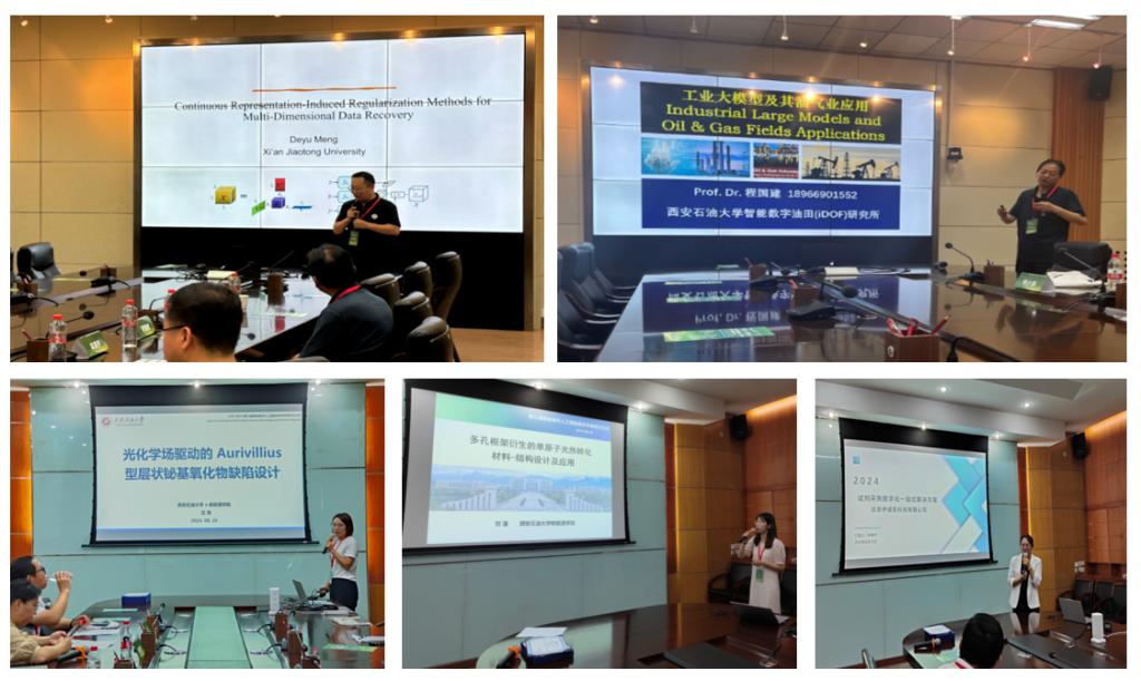 在“新能源+ ”“人工智能+ ”两个分论坛中,来自西安交通大学、西安理工大学及公司的32名师生做了专题报告,报告由折延宏、高国旺、肖美霞、安敏荣、王磊、吕英、毕佳颖、刘潼八位教师主持。国家级高层次人才、西安交通大学孟德宇教授做了题为“Continuous Representation-Induced Regularization Methods for Multi- Dimensional Data Recovery”的报告;公司程国建教授做了题为“工业大模型及其油气业应用”的报告;公司吕英副教授做了题为“光化学场驱动的Aurivillius型层状铋基氧化物缺陷设计”的报告;公司青年教师刘潼做了题为“多孔框架衍生的单原子光热转化材料-结构设计及应用”的报告。另外,西安建筑科技大学、厦门理工公司、北京伊诺凯科技有限公司等单位及公司研究生做了28个专题报告。
