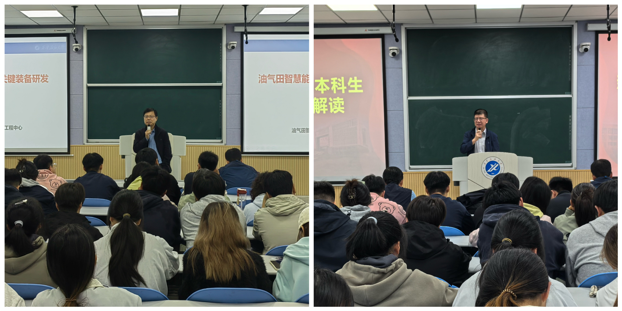 活动分为专题讲座与面对面答疑交流两个环节。在第一阶段的专题讲座中,副经理王治国教授结合自身科研教学实践,为同学们作了题为“油气田智慧能源系统构建与关键装备研发”的专题报告。他依托详实的科研案例与前沿学术理论,系统阐述了油气田智慧能源系统的发展趋势与核心技术,详细介绍了构建以新能源为主导,集多源协同、智慧运维、智慧储能、智能材料、智能设备及智慧学习于一体的智慧能源系统的重要意义与实现路径,拓宽了同学们的学术视野,激发了大家对专业领域深入探索的兴趣与热情。讲座中还融入了关于新能源与传统能源融合发展的见解,并为同学们未来求学考研规划提供了实用建议。
