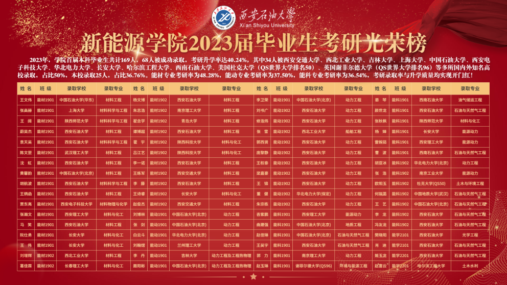截止23年5月,2019级毕业生毕业去向落实率为81%,其中考研录取率为40.24%(新能源材料与器件专业考研录取率为48.28%,能源与动力工程专业考研录取率为37.50%,新能源科学与工程专业考研录取率为36.54%,)。已就业的67人中多人被隆基绿能科技股份有限公司、三星中国半导体、国家管网集团西部管道有限责任公司、胜利油田、长庆油田等知名企业签约;公司首届本科毕业生共计169人,68人被成功录取,考研升学率达40.24%,其中34人被西安交通大学、西北工业大学、吉林大学、上海大学、中国石油大学、西安电子科技大学、华北电力大学、长安大学、哈尔滨工程大学、西南石油大学、美国杜克大学(QS世界大学排名50)、英国谢菲尔德大学(QS世界大学排名96)等多所国内外知名高校录取,占比50%,本校录取25人,占比36.76%。